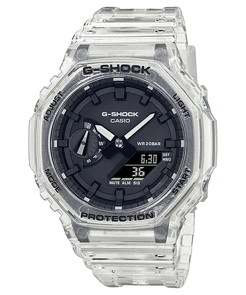 Die G-SHOCK GA-2100SKE-7A vereint ikonisches achteckiges Design mit moderner Transparenz. Dank der Carbon Core Guard Struktur ist sie ultraleicht, extrem robust und ein futuristischer Blickfang am Handgelenk – perfekt für alle, die Stil und maximale Widerstandsfähigkeit suchen.