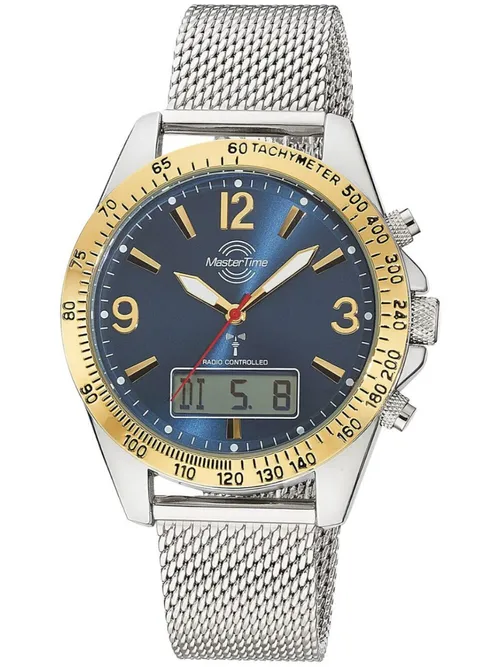 Marke: MASTER TIME • Hersteller-Nr.: MTGA-10964-32M • Hersteller Serie: Sporty Big Date Chronograph 42mm 5ATM • Funktionen: Chronograph, Datum, Ewiger Kalender, Funkuhr, Minute, Sekunde, Stunde, Tachymeter, Weltzeit, Wochentag • Antrieb: Batterie (Quarz) • Uhrwerk Bezeichnung: TD357 • Zifferblatt Farbe: Blau • Anzeige: Analog & Digital • Wasserdichte: 5 ATM • Lünette: Feststehend, mit Tachymeterskala • Oberfläche: Poliert • Gehäuse Farbe: Silber • Gehäuse Material: Edelstahl • Gehäusedicke: 11 mm • Gehäuse Form: Rund • Gehäusebreite: 42 mm • Gehäuseboden: Edelstahlboden, gepresst • Geschlecht: Herren • Glas: gehärtet, Mineralglas • Beleuchtung: Leuchtindexe, Leuchtzeiger • Stil: Chronograph • Armband Material: Edelstahl • Armband Farbe: Silber • Bandanstoßbreite: 20 mm • Schließe: Sicherheitsfaltschließe • Max. Handgelenkumfang: 215 mm • Artikelgewicht: 0.10 kg • Lieferumfang: Anleitung, Box, Garantie Dok., Umkarton